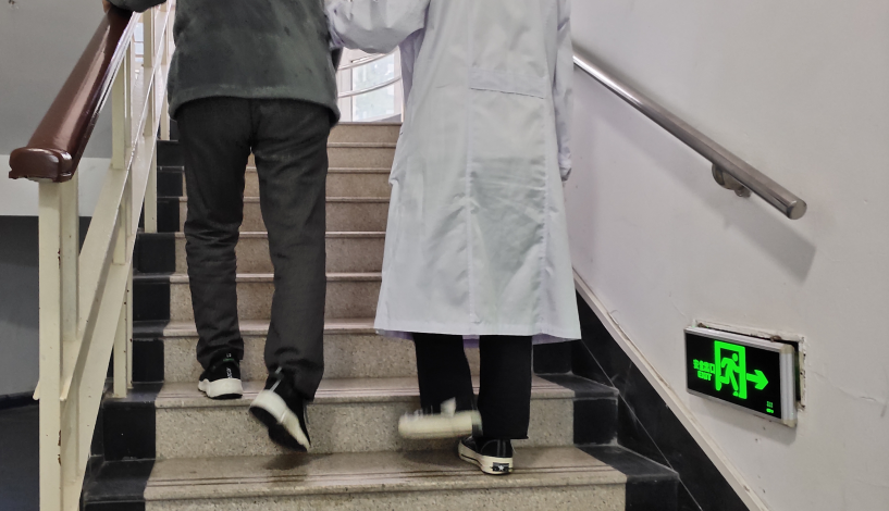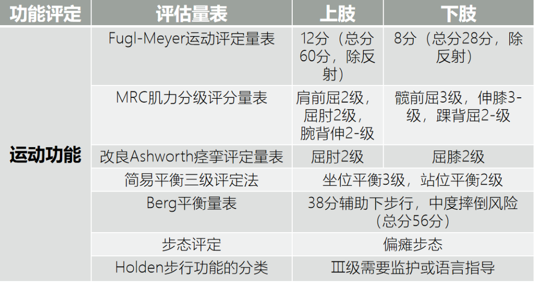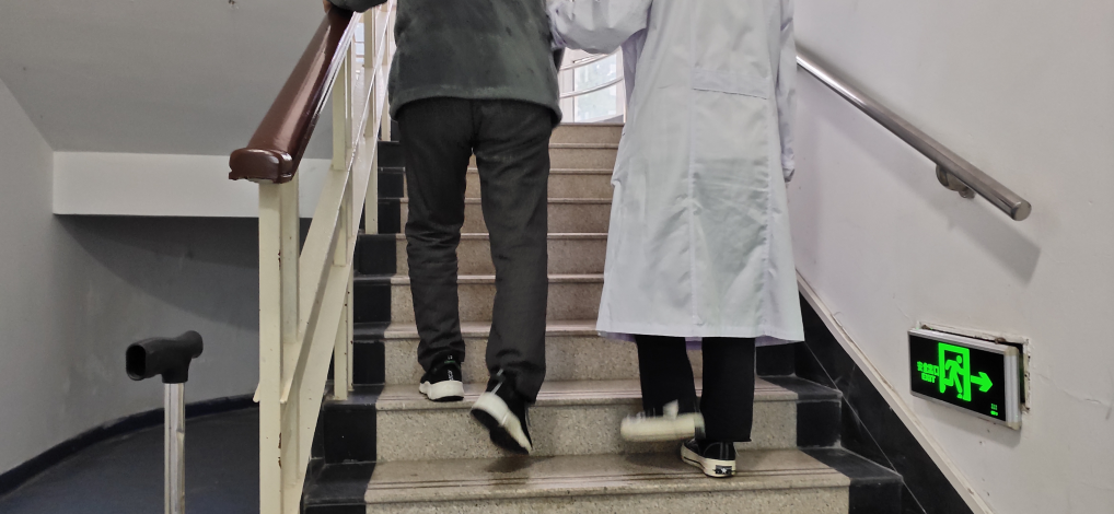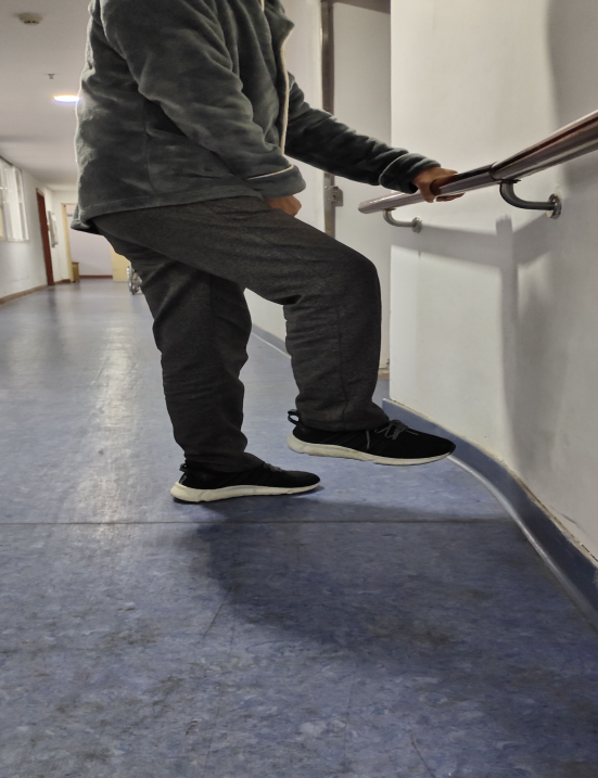 患者脱离拐杖可行走20米左右(需治疗师或者家属监护);患者在家可独自(借助拐杖辅助)从三楼走下楼,之后在平地上步行四百米左右到达公园,同好友打牌,结束之后独自步行回家